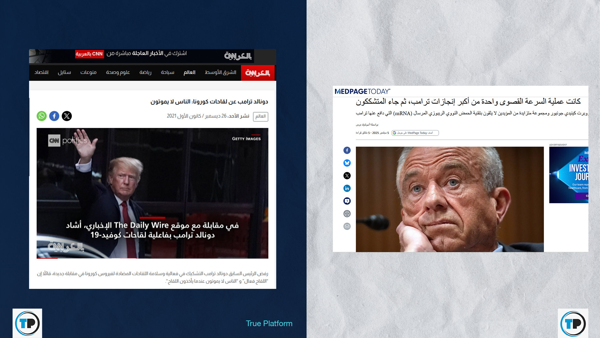 -يتناقض الادعاء كلياً مع موقف ترامب المعلن؛ حيث لطالما افتخر الأخير بإنجاز إدارته في تطوير اللقاحات عبر مبادرة “عملية السرعة القصوى”، ووصف اللقاحات في لقاءات متعددة بأنها “منقذة للحياة”.