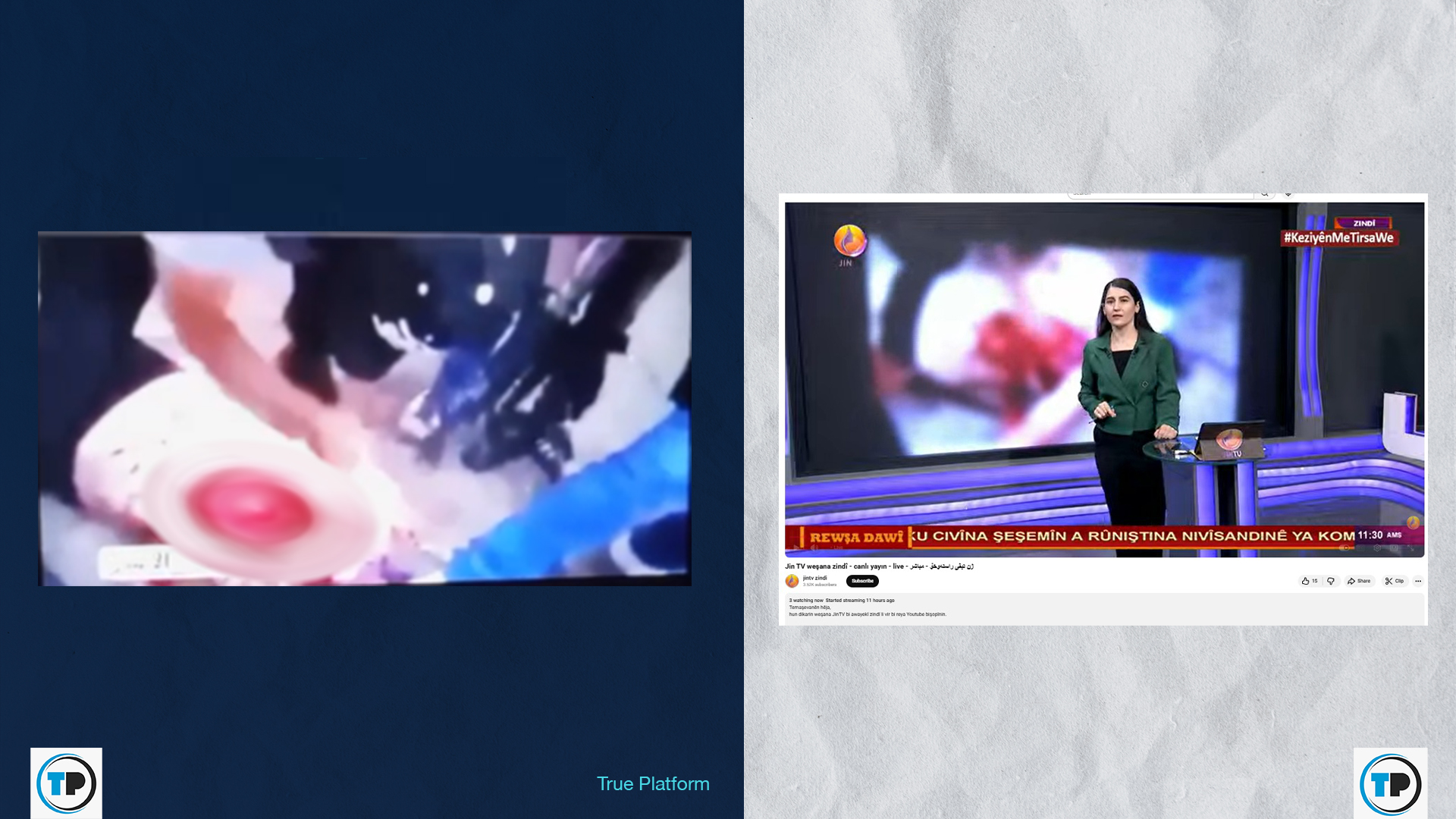 وقالت المذيعة خلال بث مباشر للقناة أثناء عرض نسحة مموهة من المقطع أنه يظهر “تعذيب شاب كردي في الرقة من قبل عناصر تابعين لهيئة تحرير الشام والدولة التركية وتنظيم داعش، ومن ثم قيامهم باقتلاع قلبه وأكله”.