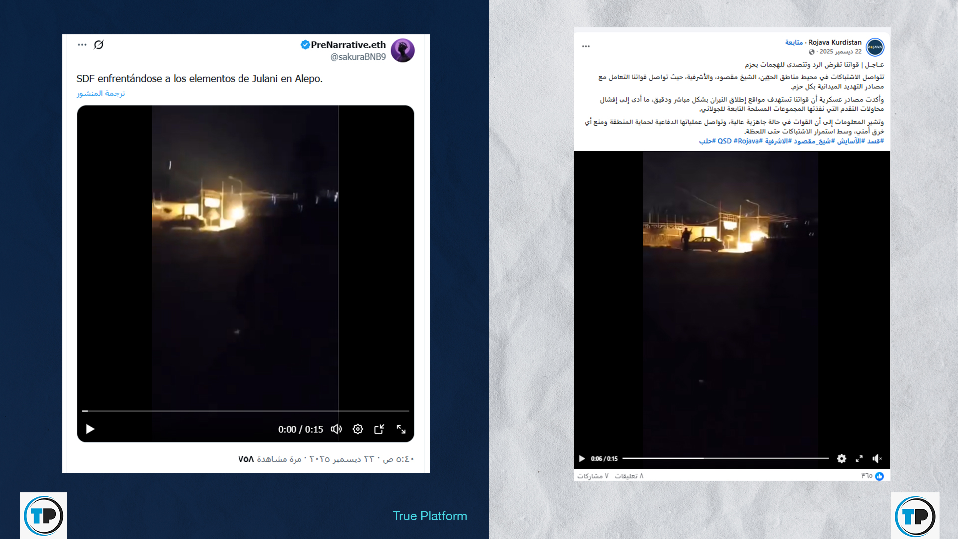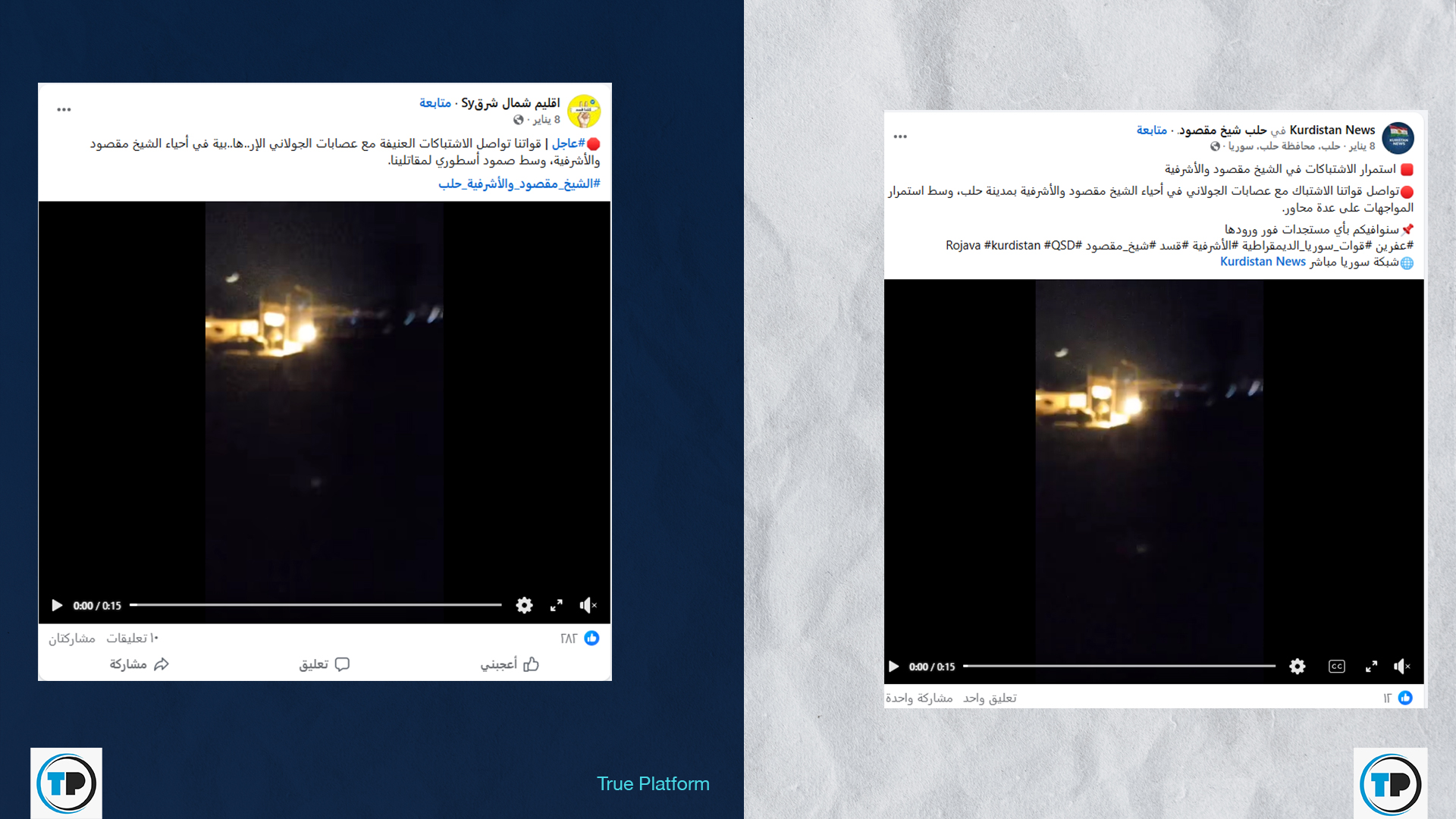 -تبين أن الفيديو قديم، حيث نُشر لأول مرة بتاريخ 23 كانون الأول/ ديسمبر 2025، وصوّر حينها اشتباكات سابقة في حي الشيخ مقصود.