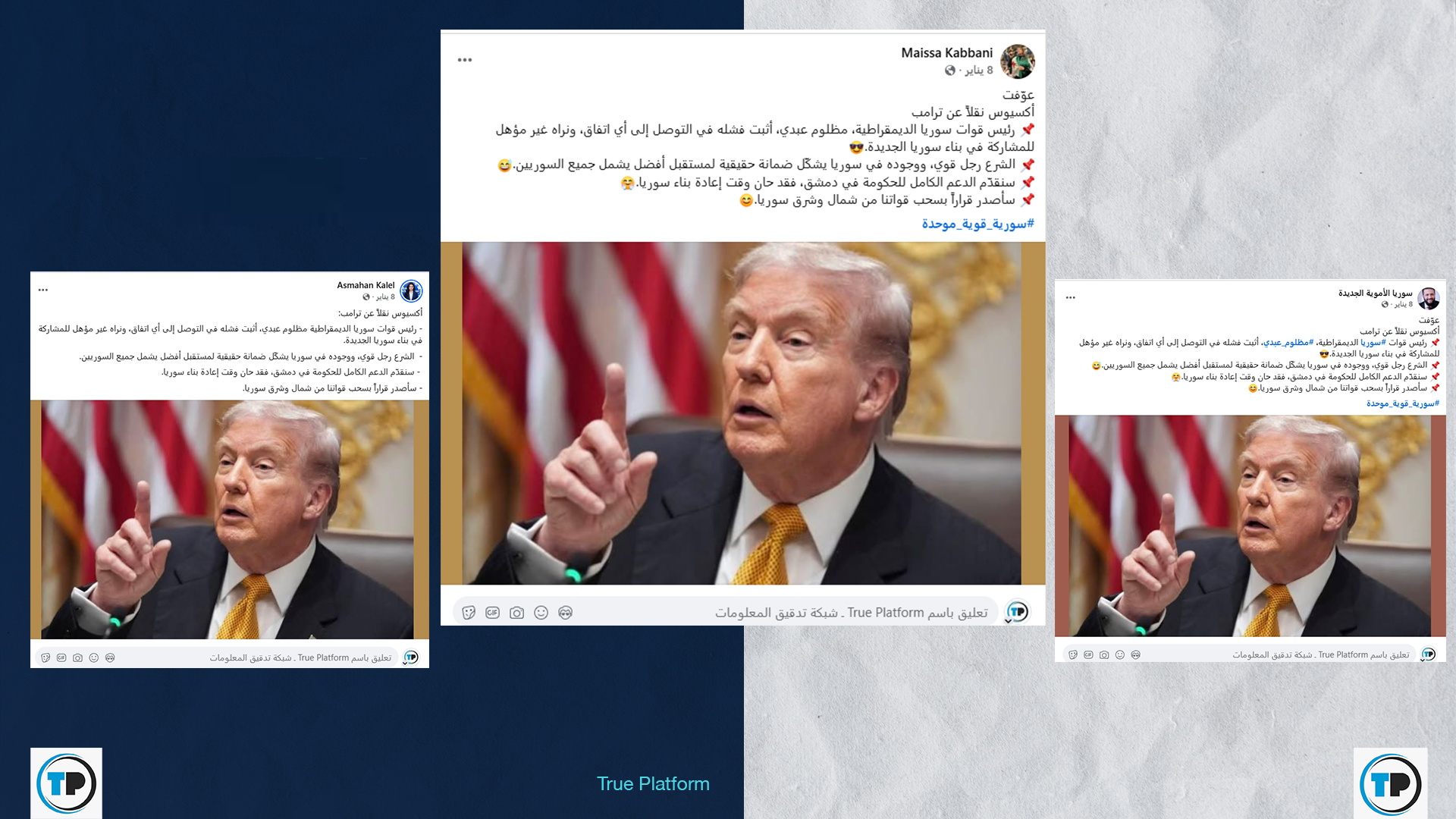 تداول نشطاء سياسيون وصفحات وحسابات عبر مواقع التواصل الاجتماعي تصريحاً منسوباً لموقع “أكسيوس” (Axios) نقلاً عن الرئيس الأمريكي دونالد ترامب. زعم الادعاء أن ترامب صرح بأن “رئيس قوات سوريا الديمقراطية، مظلوم عبدي، أثبت فشله في التوصل إلى أي اتفاق، ونراه غير مؤهل للمشاركة في بناء سوريا الجديدة”.