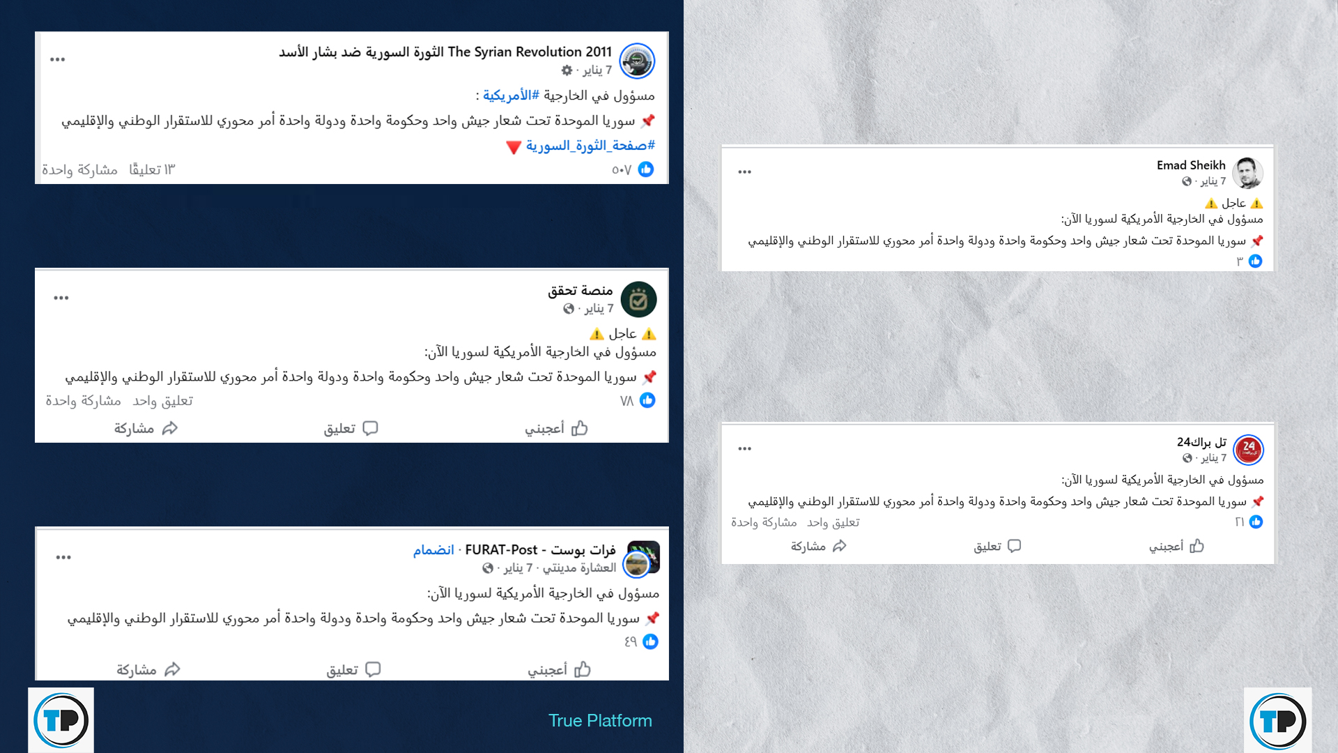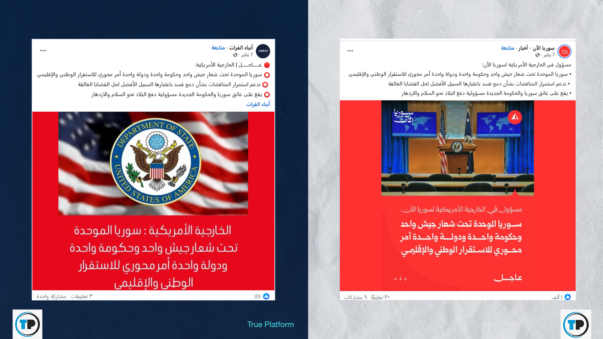 -بالعودة إلى موقع وحسابات منصة سوريا الآن، تبين أنها نقلت عن مسؤول في الخارجية الأمريكية لسوريا تصريحاً يتضمن ثلاث نقاط رئيسية هي: