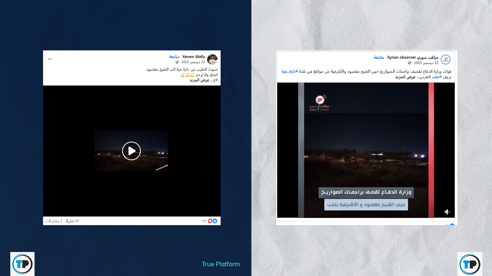 بالتزامن مع الاشتباكات الجارية في مدينة حلب، تداولت حسابات وصفحات عبر منصتي فيسبوك وإكس، مقطع فيديو مرفقاً بادعاء يزعم أنه يوثق قصف قوات وزارة الدفاع براجمات الصواريخ لحيي الشيخ مقصود والأشرفية، انطلاقاً من مواقع في بلدة دارة عزة بريف حلب الغربي.