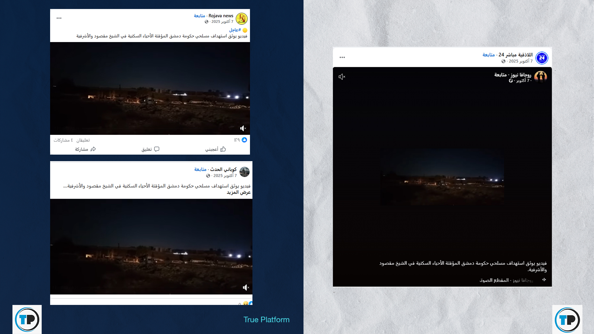 -أظهر البحث العكسي عن الصورة أن المقطع المتداول قديم ويعود إلى مطلع شهر تشرين الأول/أكتوبر 2025، على أنه يوثق استهدافاً للجيش السوري لحيي الشيخ مقصود والأشرفية براجمات الصواريخ من دارة عزة.