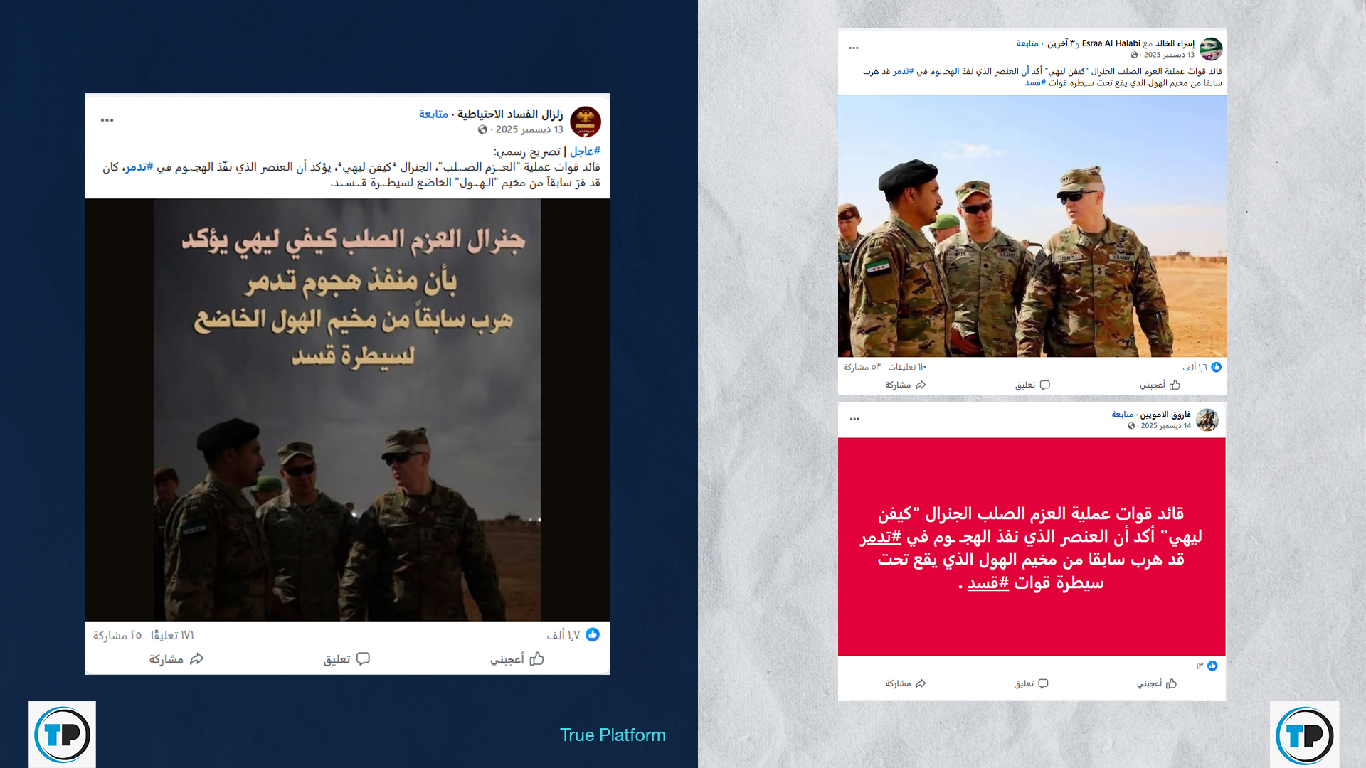 تداول نشطاء، إلى جانب صفحات وحسابات عبر منصة فيسبوك مؤخراً، تصريحات منسوبة إلى القائد السابق لقوات عملية “العزم الصلب”، الجنرال كيفن ليهي، زعموا فيها أنه أكد أن العنصر الذي نفذ الهجوم على الجنود الأمريكيين في تدمر كان قد هرب سابقاً من مخيم الهول الخاضع لسيطرة قوات سوريا الديمقراطية (قسد).