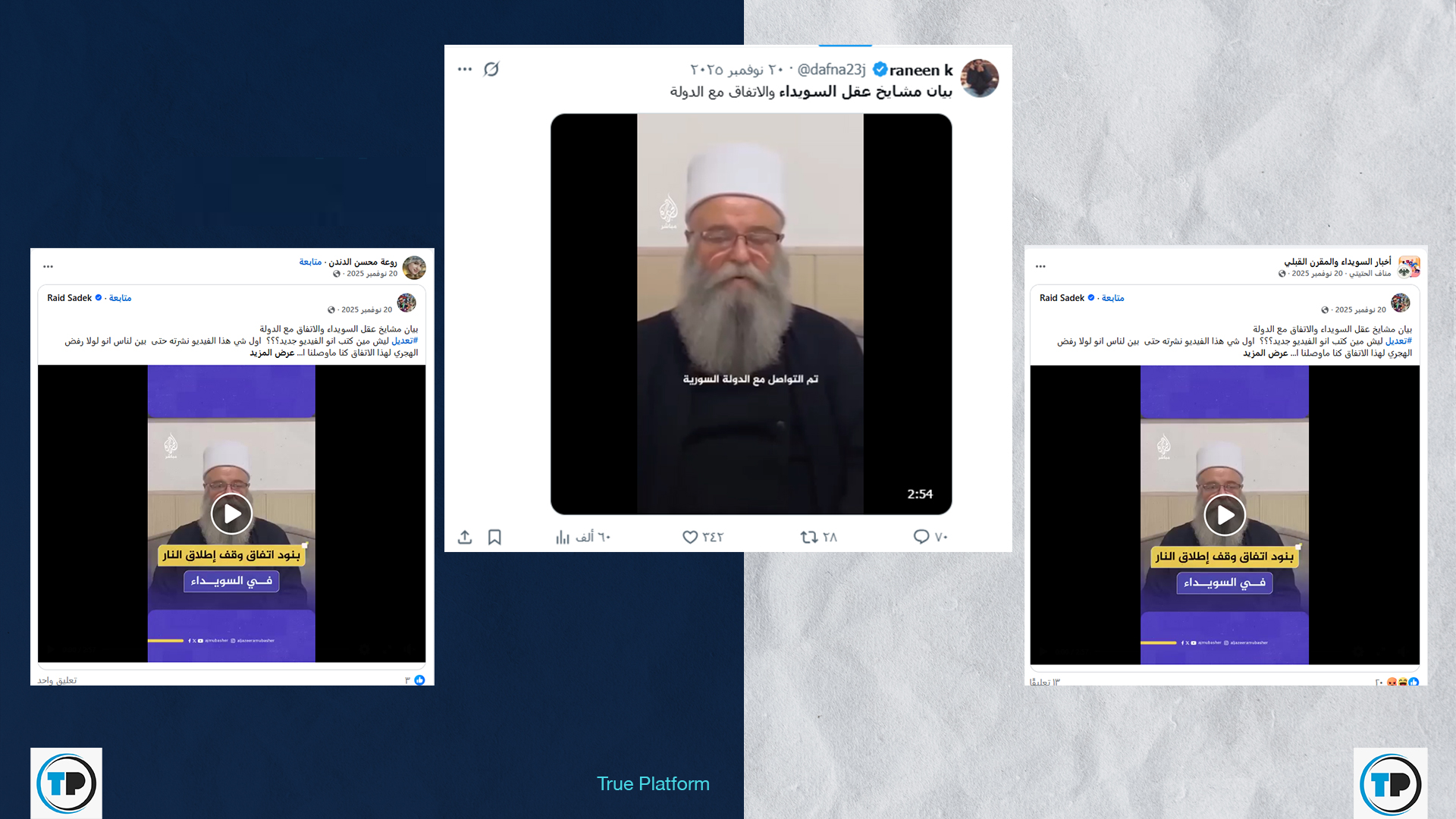 انتشر مؤخراً عبر منصتي فيسبوك وإكس مقطع فيديو مرفق بادعاء يزعم أنه بيان صادر عن مشايخ العقل في السويداء، يتضمن إعلاناً عن اتفاق جديد مع الحكومة السورية.