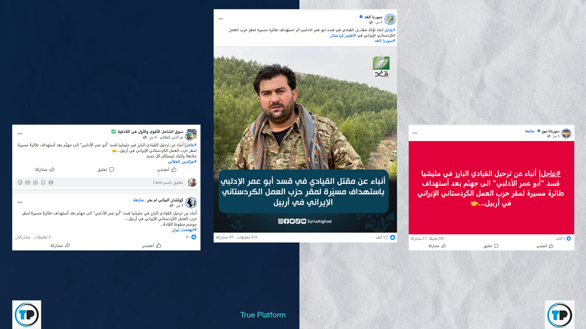 تداولت صفحات وحسابات على منصة فيسبوك، مؤخراً، أنباء عن مقتل القيادي في قوات سوريا الديمقراطية “أبو عمر الأدلبي” جراء استهداف طائرة مسيرة لمقر حزب العمل الكردستاني في أربيل.