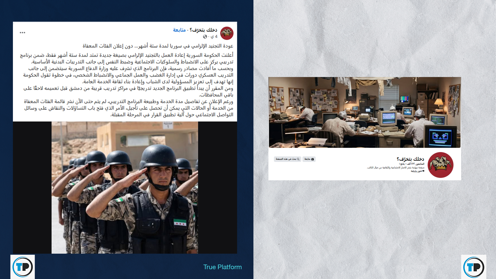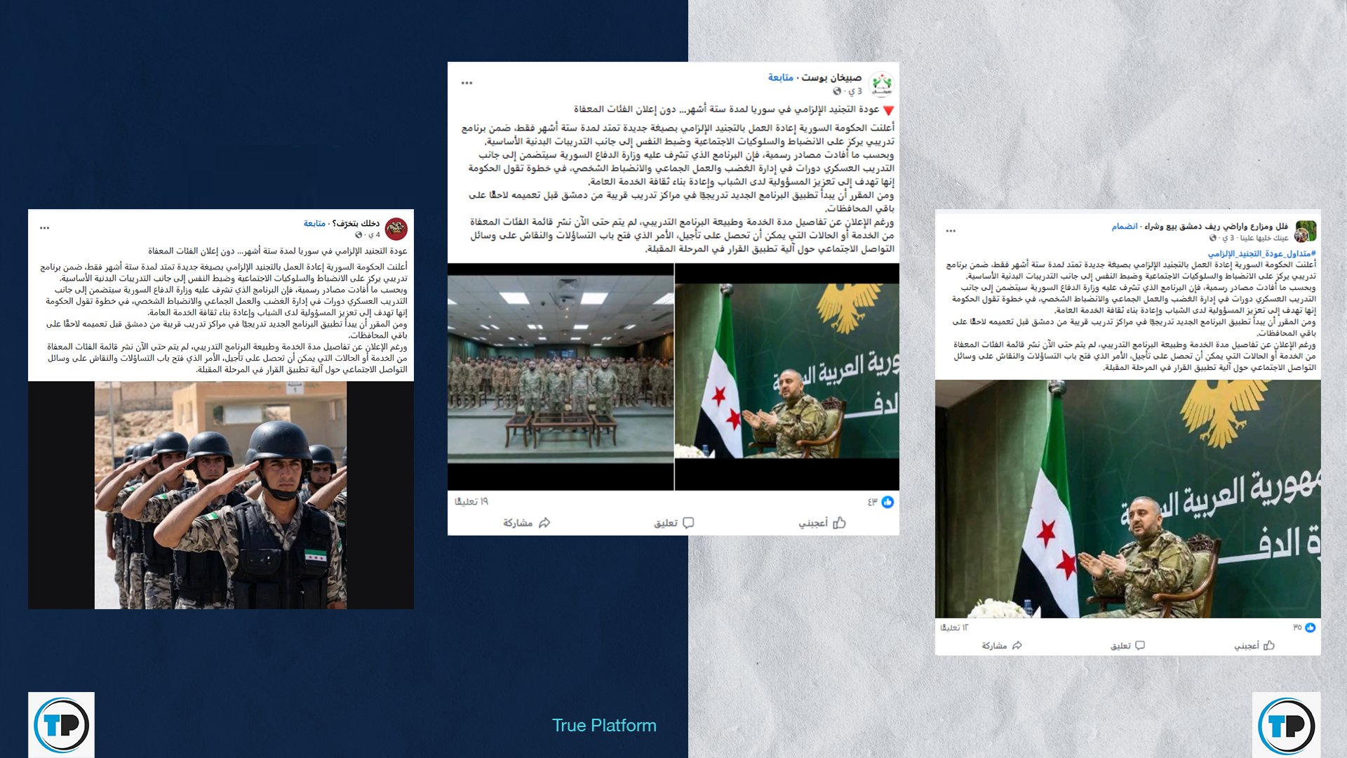 تداول حسابات وصفحات عبر منصة فيسبوك، مؤخراً، ادعاء مفاده أن الحكومة السورية أعلنت إعادة العمل بالتجنيد الإلزامي بصيغة جديدة تمتد لمدة ستة أشهر فقط.