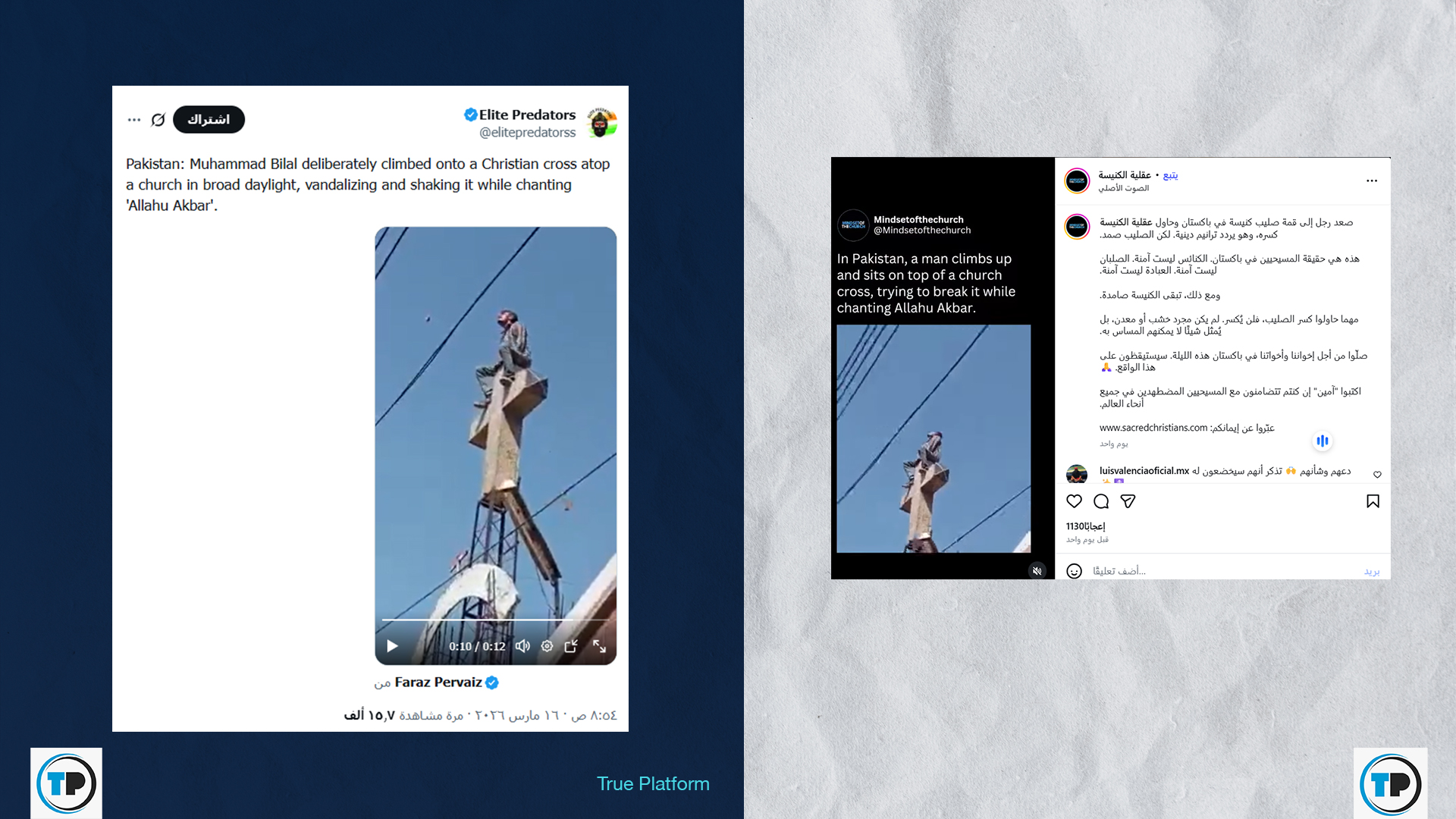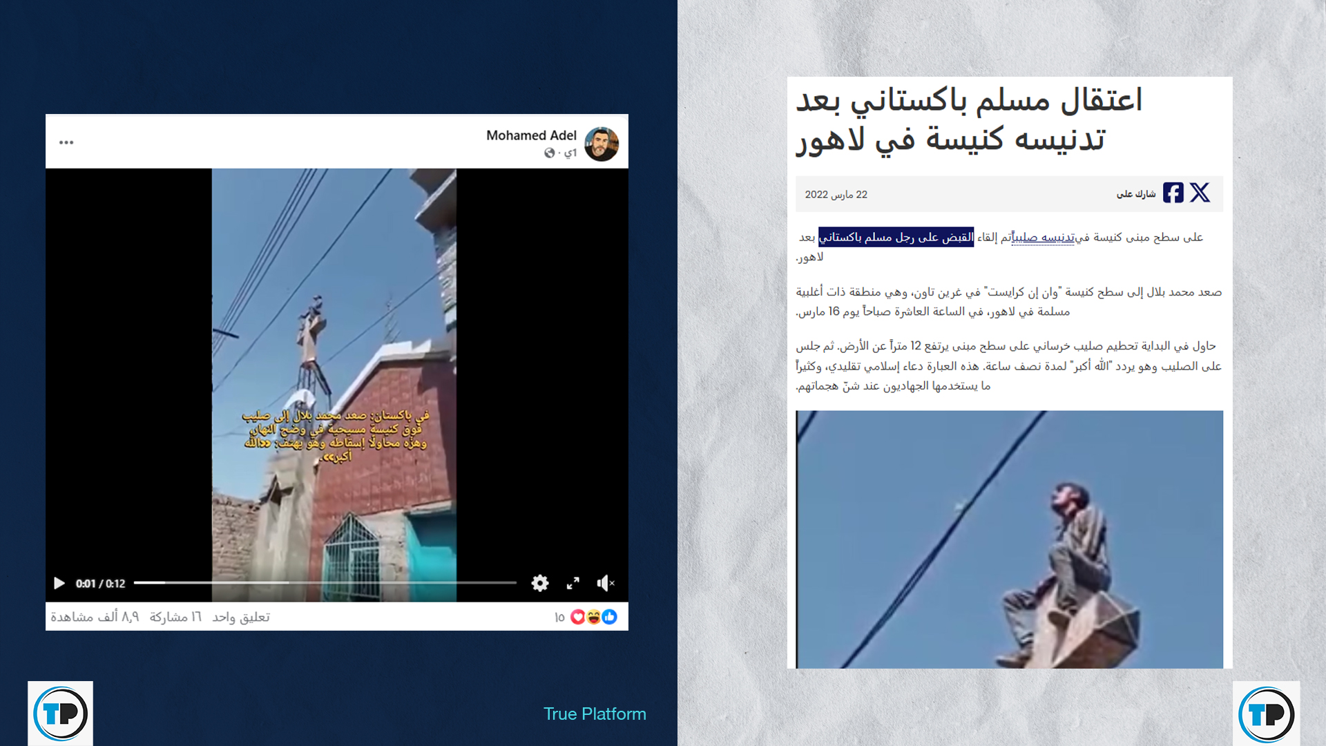 – تبين أن وسائل إعلام أوردت في آذار/مارس 2022، أن الشرطة الباكستانية ألقت القبض على رجل بعد تدنيسه صليباً على سطح مبنى كنيسة بمدينة لاهور.