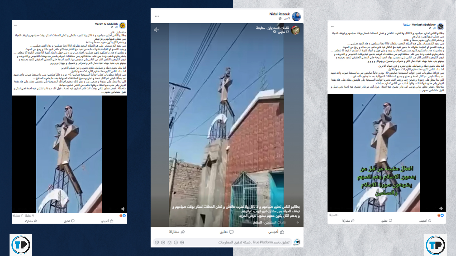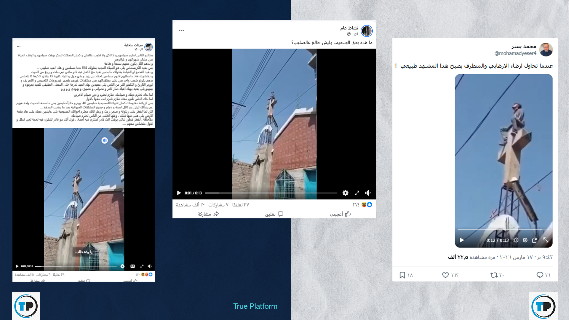 تداولت صفحات وحسابات عبر منصات التواصل، مؤخراً، مقطع فيديو، يُظهر شاباً وهو يعتلي صليباً فوق مبنى كنسي ويحاول كسره ويهتف (الله أكبر). وفي حين لم يشر بعض ناشري المقطع إلى مصدره تداوله آخرون مع منشورات توحي أنه صوِّر في سوريا.