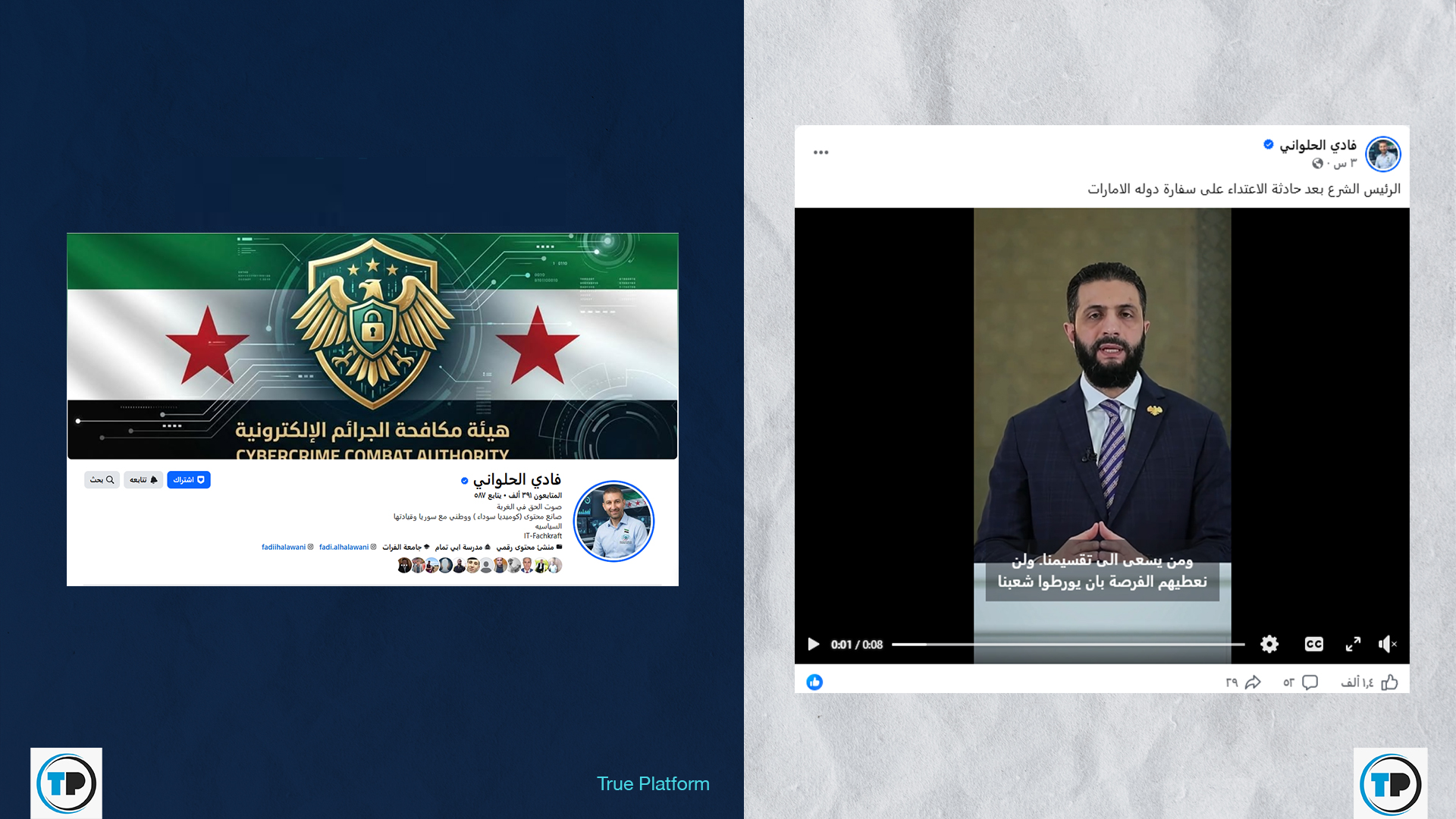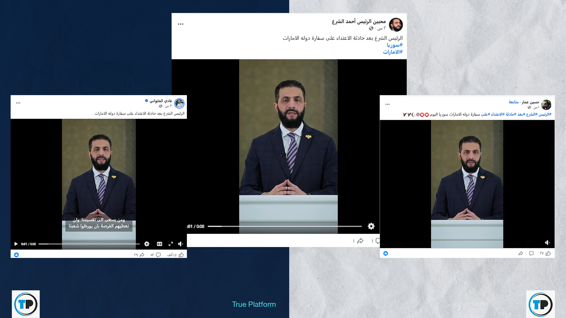 تداولت صفحات وحسابات على منصة فيسبوك، مؤخراً، مقطع فيديو للرئيس السوري أحمد الشرع مع مزاعم أنه ظهور حديث عقب حادثة الاعتداء على سفارة الإمارات العربية المتحدة في دمشق.