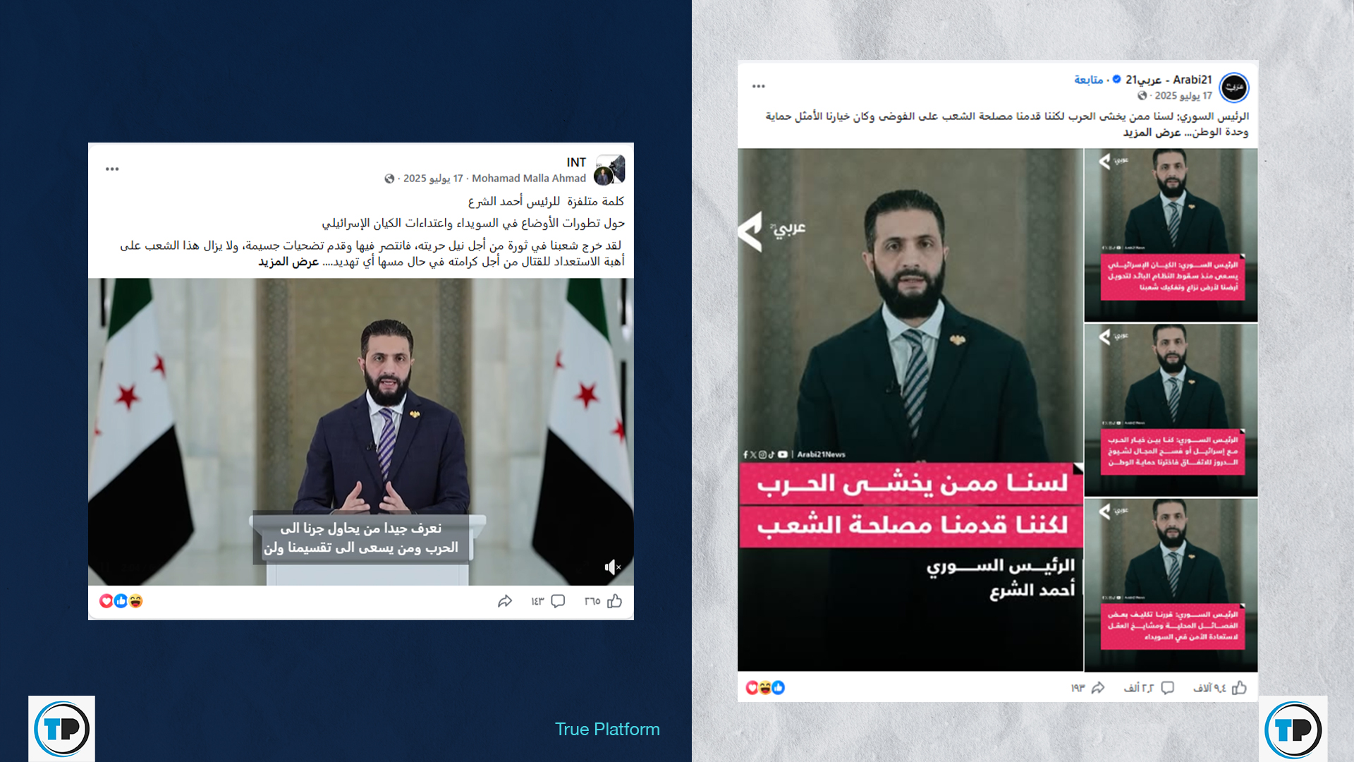 – أظهر البحث العكسي أن المقطع المتداول مجتزأ من كلمة للرئيس تعود لمنتصف تموز/يوليو 2025، عقب أحداث محافظة السويداء، ولا علاقة له بالأحداث الجارية.