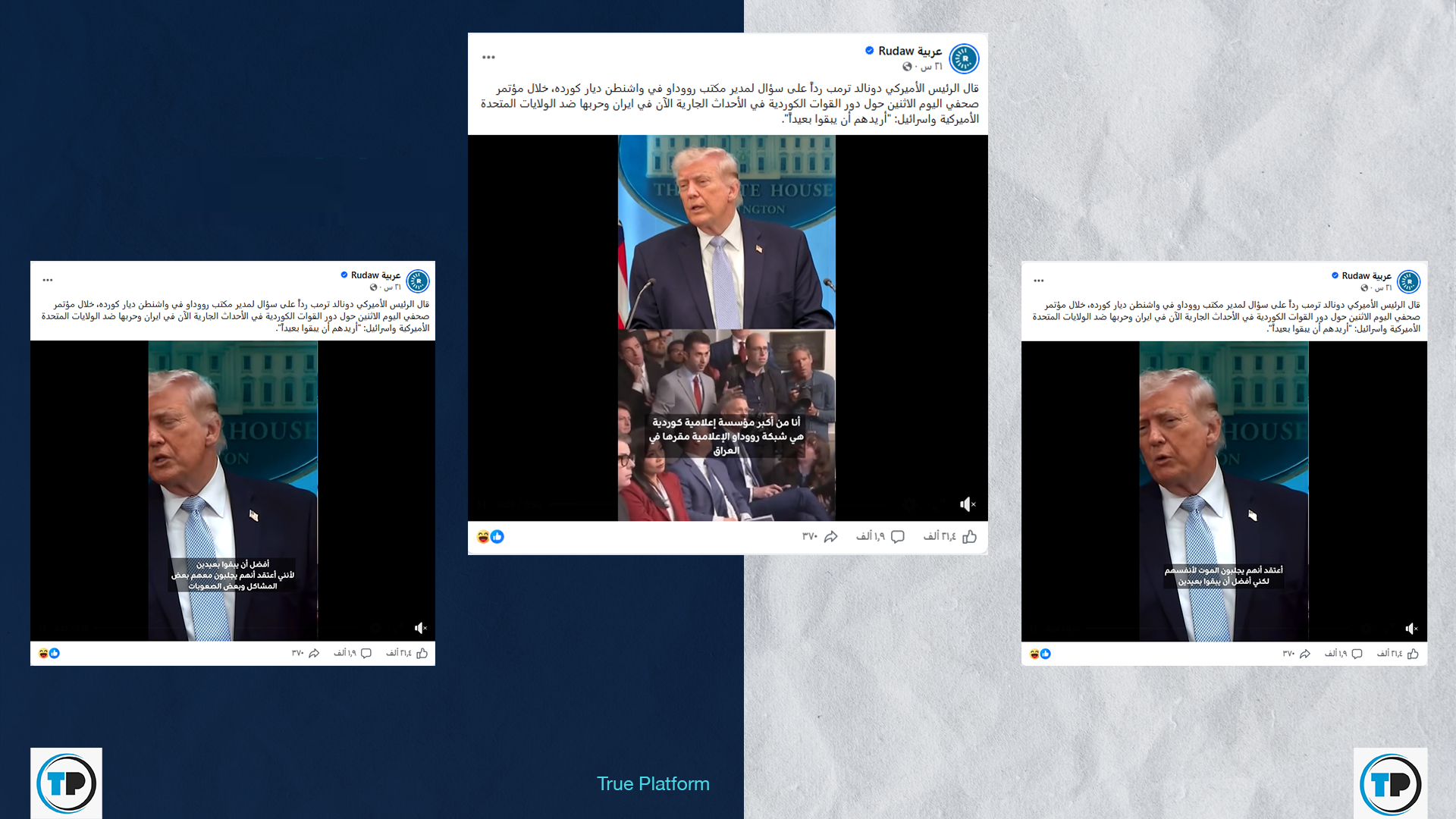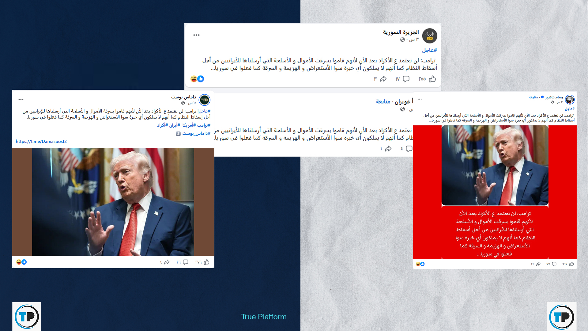 تداولت صفحات وحسابات سورية عبر منصة فيسبوك، مؤخراً، تصريحات منسوبة للرئيس الأمريكي دونالد ترامب، يزعم فيها توقفه عن الاعتماد على الأكراد متهماً إياهم بـ “سرقة الأموال والأسلحة” التي أُرسلت لإسقاط النظام الإيراني، واصفاً إياهم بـ “قلة الخبرة والاستعراض”.