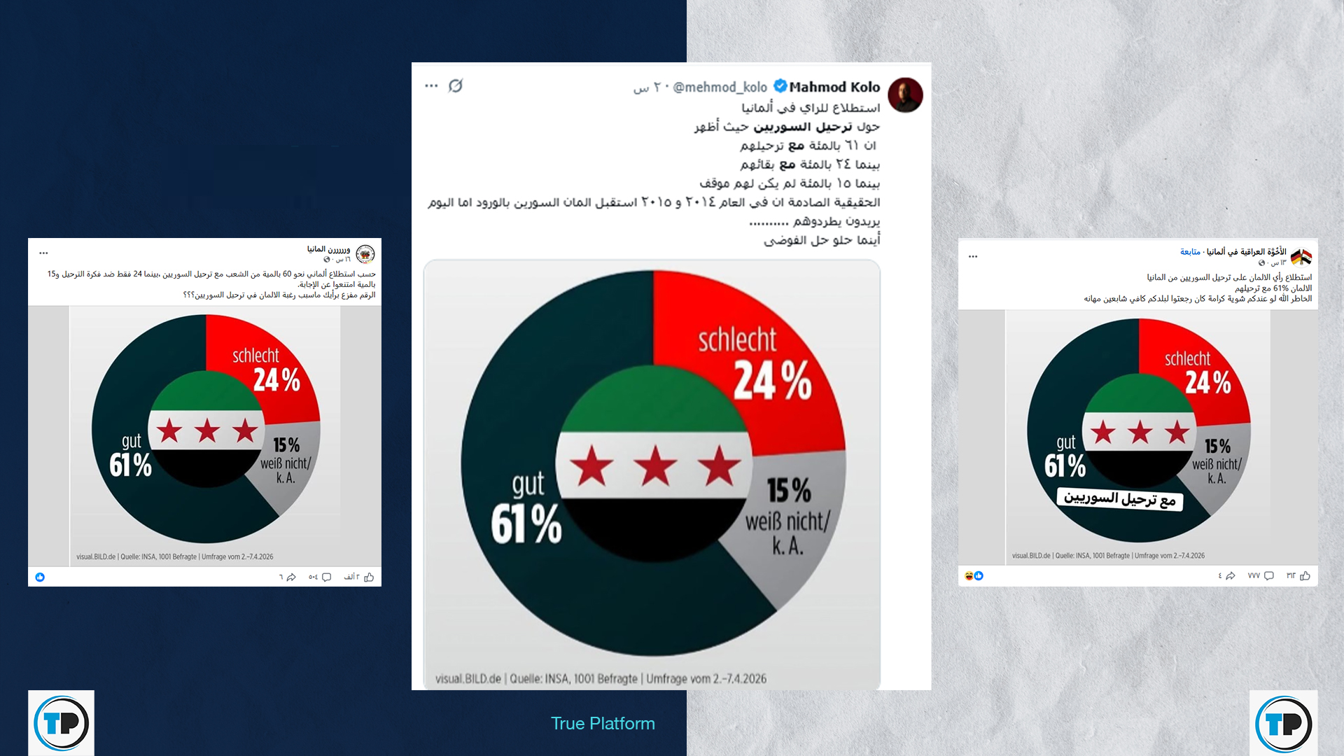 تداولت حسابات وصفحات عبر منصتي فيسبوك وإكس، مؤخراً، ادعاءً يزعم أن استطلاعاً للرأي في ألمانيا كشف أن نحو 60 بالمئة من الألمان يؤيدون ترحيل السوريين ،بينما يعارض 24 المئة فقط فكرة الترحيل، وامتنع 15 بالمئة عن الإجابة.