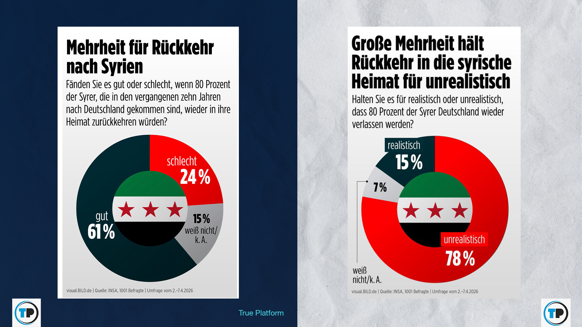 – تبين أن الاستطلاع مرتبط بسياق سياسي محدد، إذ جاء بعد تصريح للمستشار الألماني حول إمكانية عودة 80بالمئة من السوريين عقب لقائه بالرئيس السوري أحمد الشرع في برلين نهاية آذار/مارس 2026. لذا السؤال موجّهاً حول مقترح سياسي معين وليس قياساً عاماً للرأي تجاه السوريين كافة.