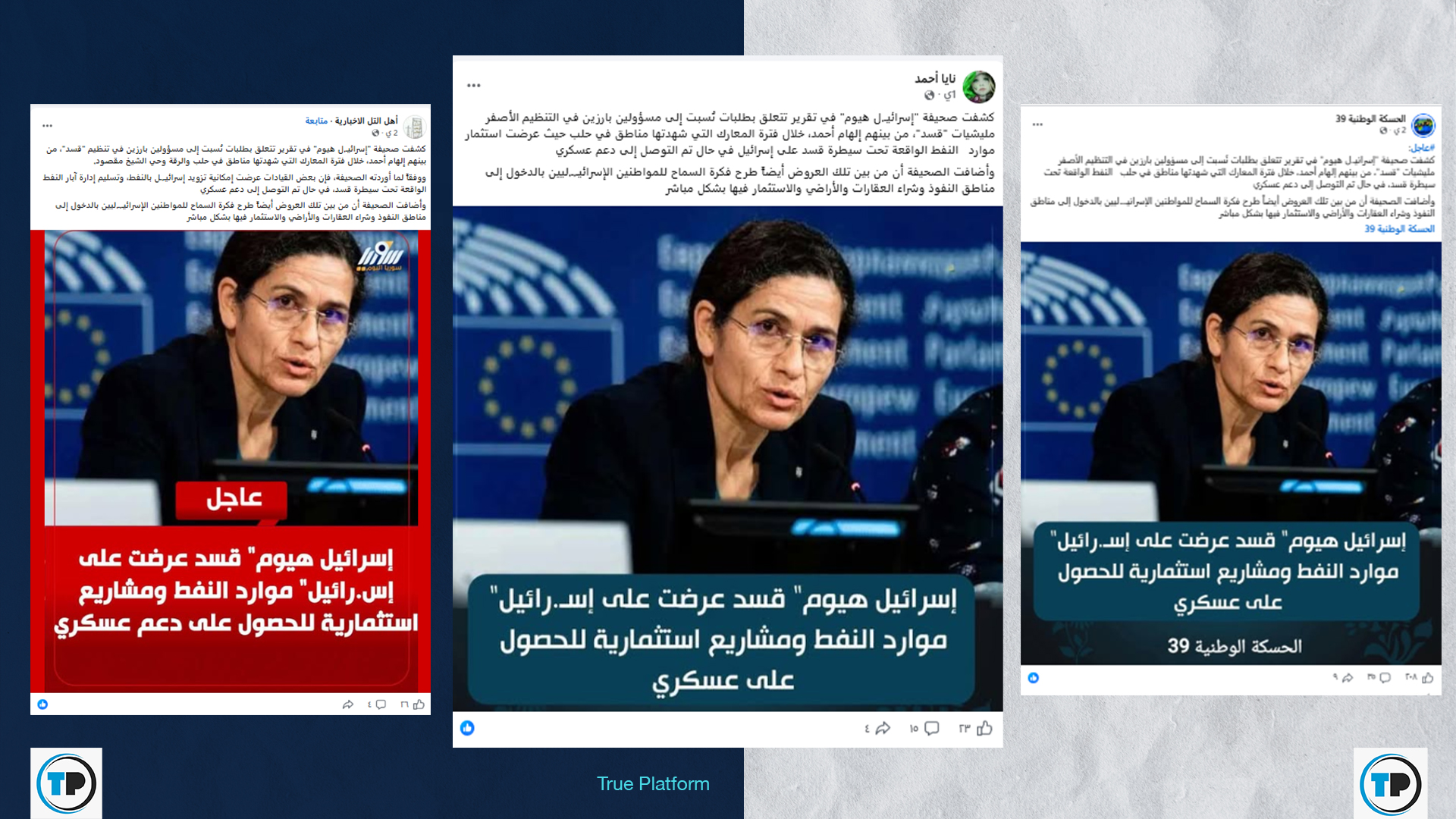 تداولت صفحات وحسابات عبر منصة فيسبوك، مؤخراً، ادعاءات تزعم أن صحيفة “إسرائيل هيوم” نشرت تقريراً يكشف عن عروض قدمتها القيادية في الإدارة الذاتية “إلهام أحمد” لإسرائيل، تتضمن تزويدها بالنفط وتسليم إدارة الآبار والسماح للإسرائيليين بشراء العقارات والاستثمار شمال شرقي سوريا مقابل دعم عسكري.
