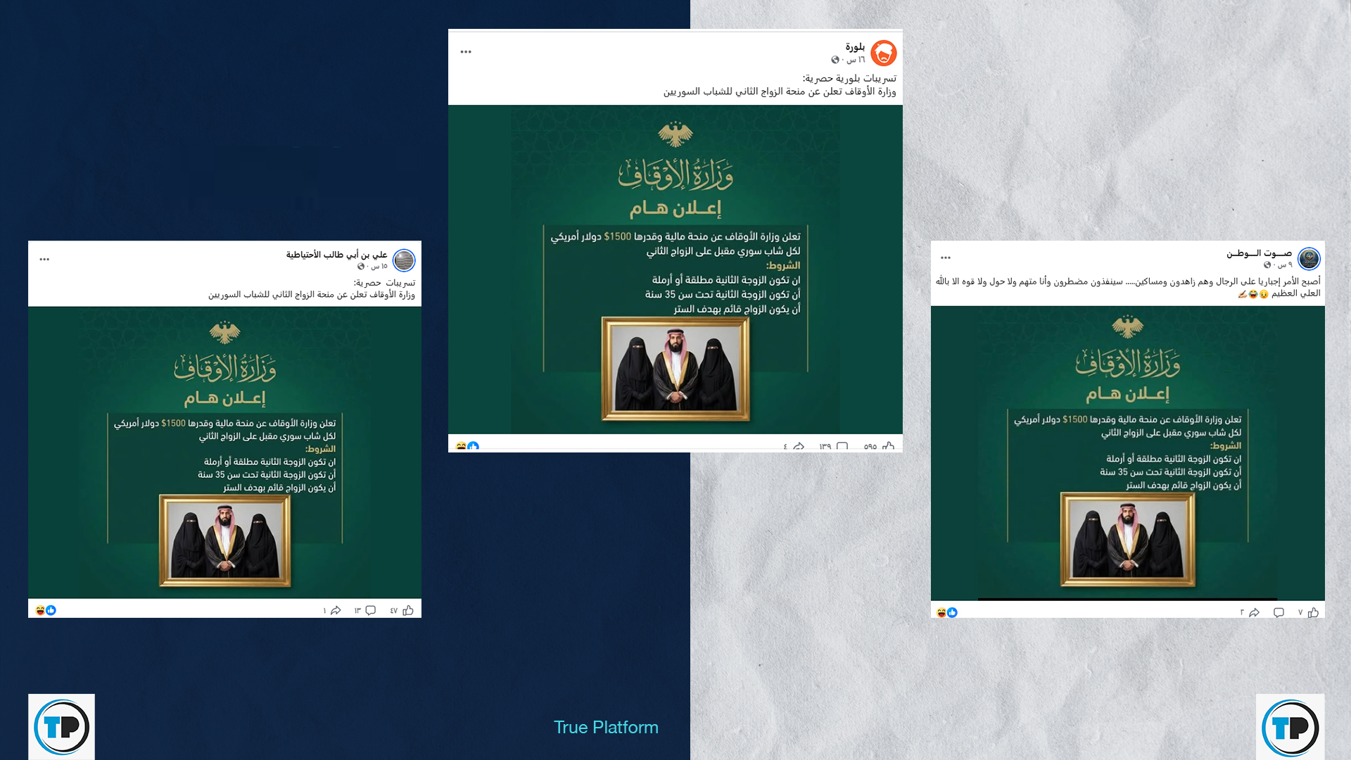 – الادعاء بأن وزارة الأوقاف السورية أعلنت عن منحة مالية للشباب لدعم الزواج الثاني هو ادعاء غير صحيح.