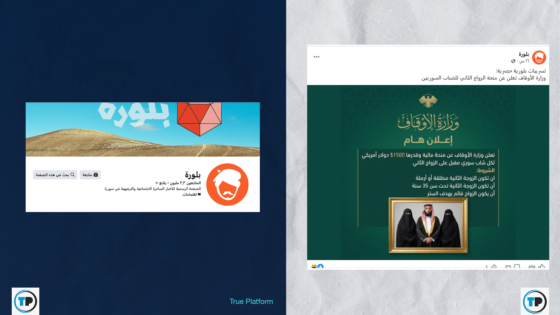 تداولت حسابات وصفحات على منصة فيسبوك، مؤخراً، صورة إعلان منسوبة لوزارة الأوقاف السورية، يزعم الإعلان تقديم منحة مالية قدرها 1500 دولار أمريكي لكل شاب سوري مقبل على الزواج الثاني، بشرط أن تكون الزوجة الثانية مطلقة أو أرملة وتحت سن 35 عاماً، وأن الهدف من الزواج هو “الستر”.