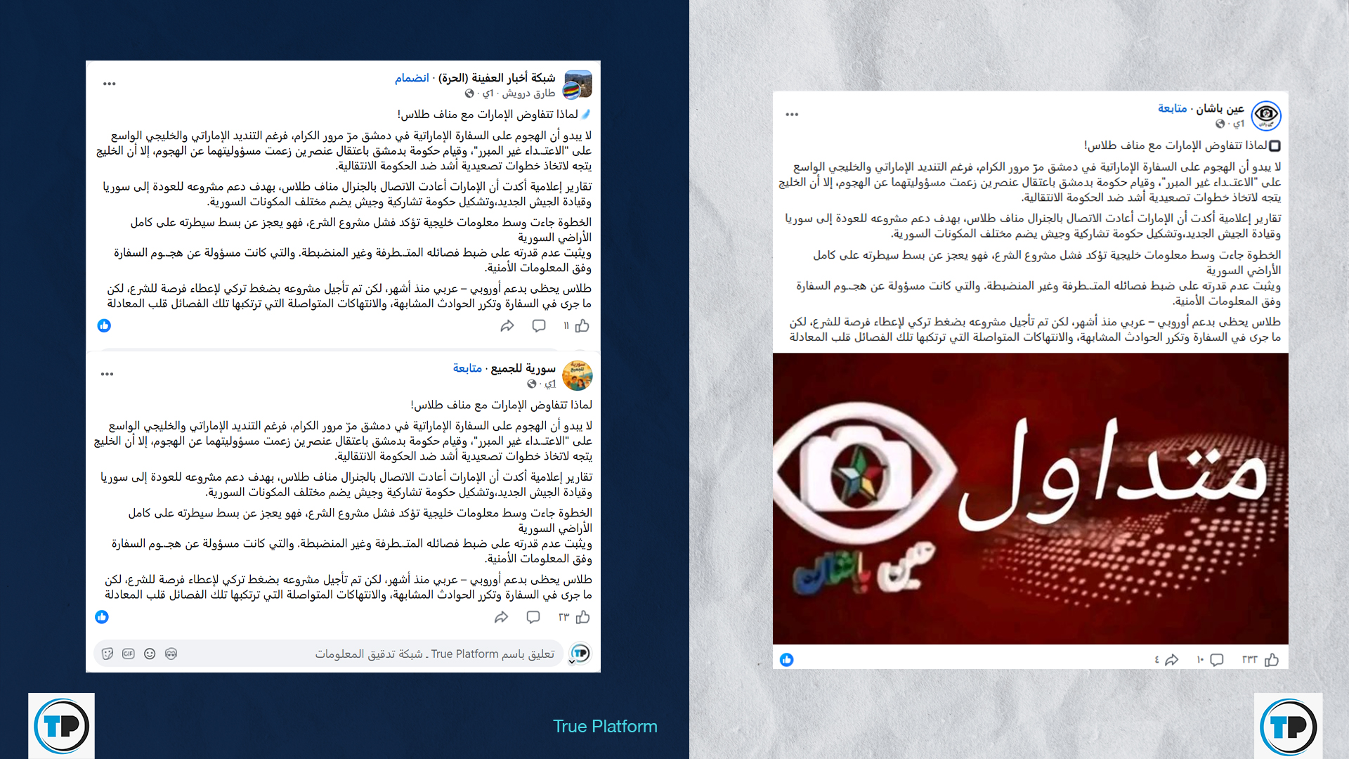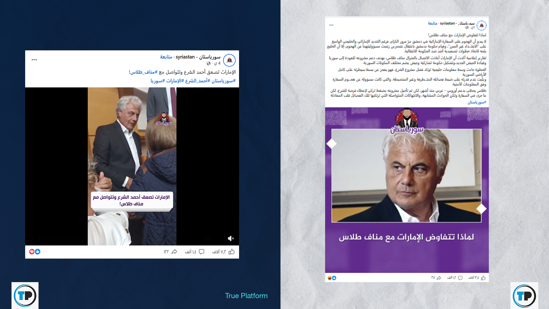 تداولت صفحات وحسابات على منصة فيسبوك، مؤخراً، ادعاءات تزعم أن دولة الإمارات العربية المتحدة “أعادت الاتصال” بالعميد المنشق مناف طلاس، بهدف دعم مشروعه لتشكيل “جيش سوري جديد” وحكومة انتقالية تشاركية. وربط ناشرو الادعاء هذا التحرك بحادثة الاعتداء على السفارة الإماراتية في دمشق مطلع نيسان/أبريل الجاري، معتبرين إياه دليلاً على رغبة إماراتية في إيجاد بديل للحكومة الانتقالية برئاسة أحمد الشرع.