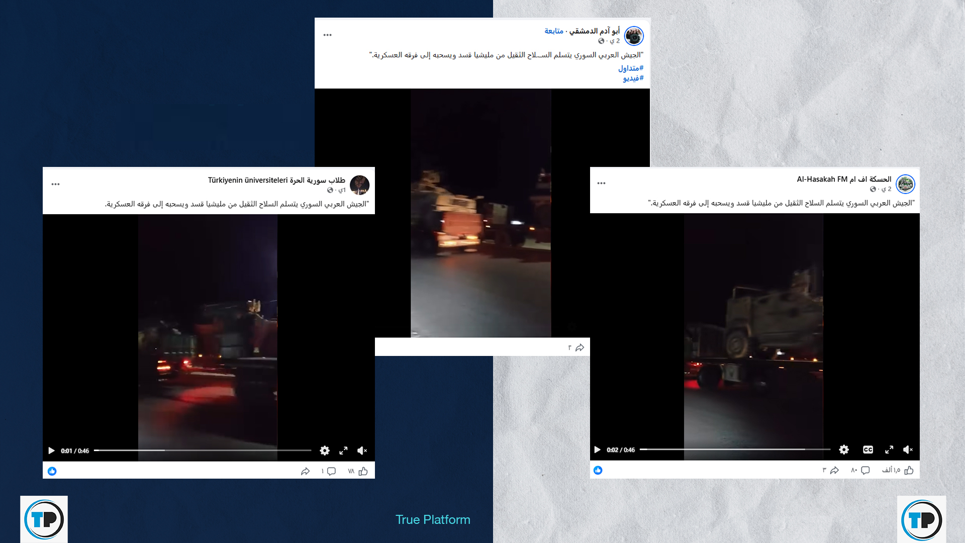 تداولت حسابات وصفحات على منصة فيسبوك، مؤخراً، مقطع فيديو يصور قافلة عسكرية تضم معدات ثقيلة تتحرك ليلاً، وزعم ناشروه أن الفيديو يوثق تسلُم الجيش السوري أسلحة ثقيلة من “قوات سوريا الديمقراطية” (قسد) وسحبها إلى فرقه العسكرية، وذلك في ظل التطورات الميدانية الأخيرة التي تشهدها البلاد.
