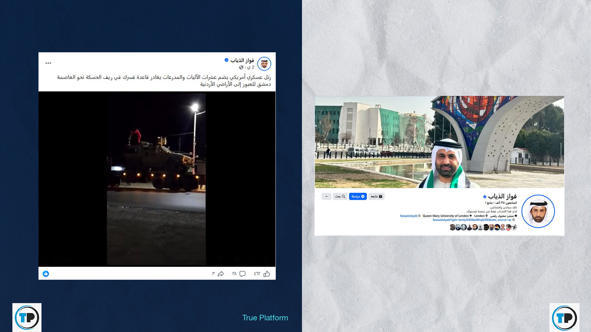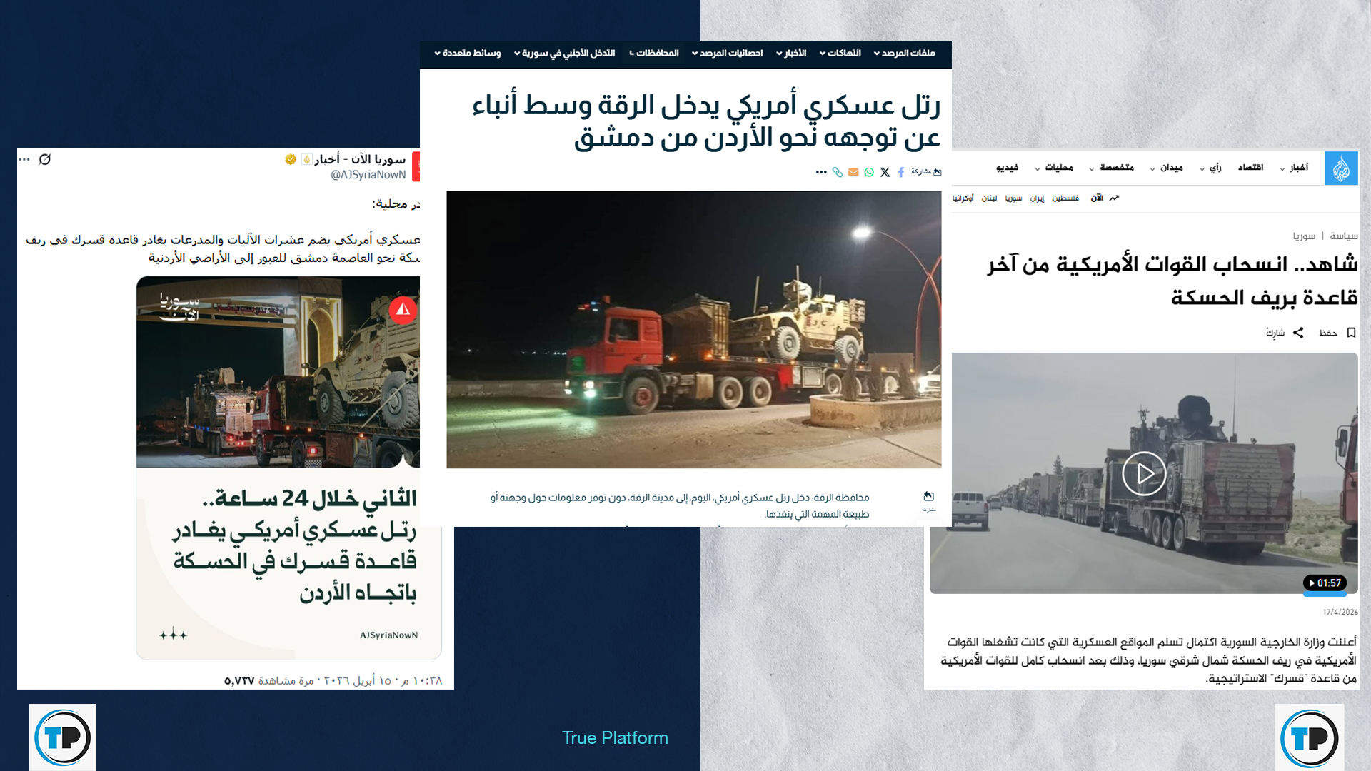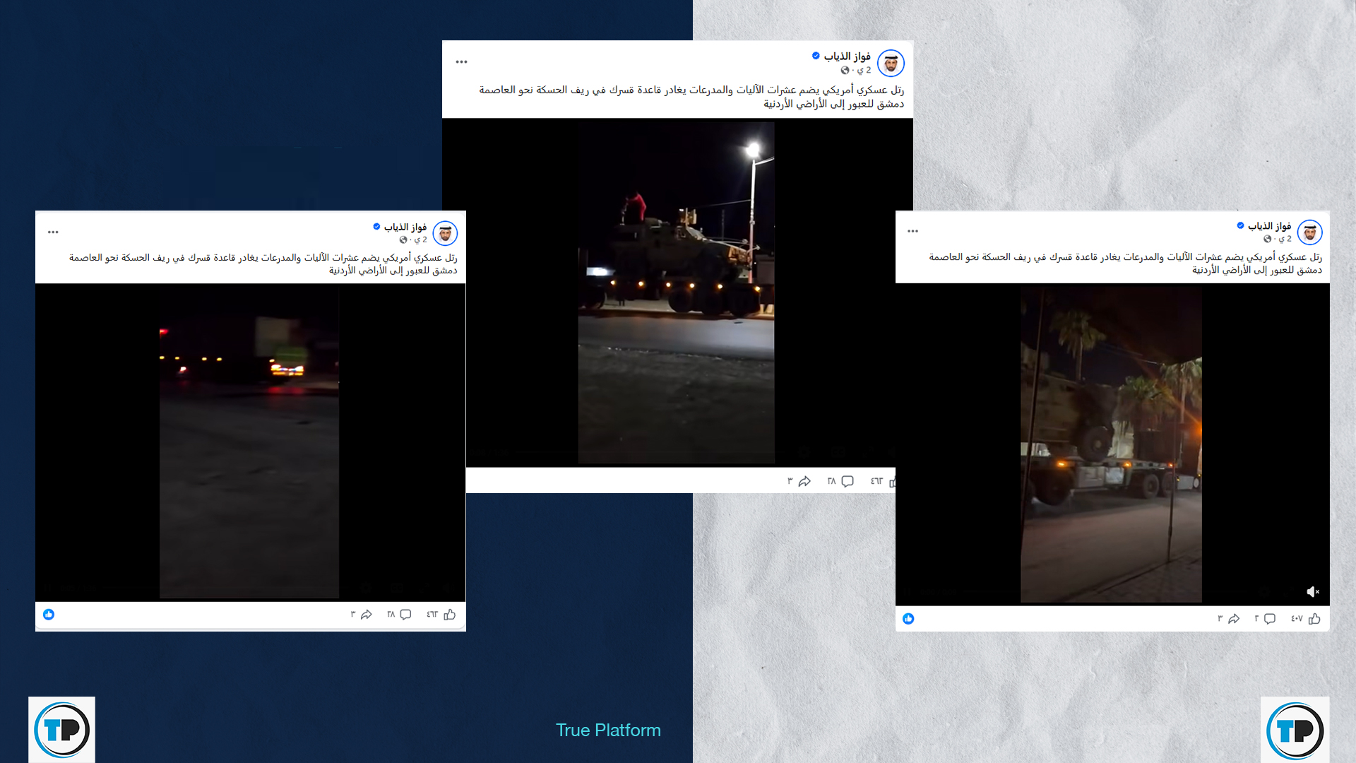 – أظهر البحث أن ذياب نشر أكثر من مقطع لذات الرتل بتوقيت متقارب مع منشورات تؤكد أنه رتل أمريكي غادر قاعدة قسرك في ريف الحسكة نحو العاصمة دمشق للعبور إلى الأراضي الأردنية.