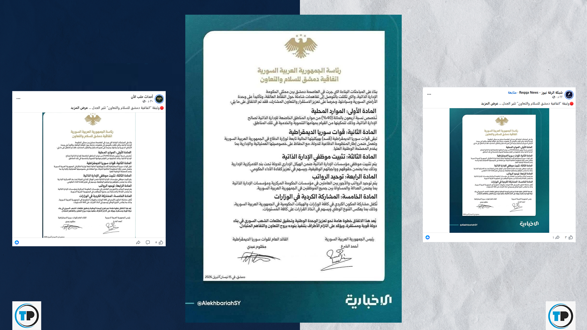 تداولت حسابات وصفحات على منصة فيسبوك، إلى جانب مجموعات عبر تطبيق “واتساب”، صورة لوثيقة منسوبة لرئاسة الجمهورية، قيل إنها نص اتفاقية جديدة مزعومة تحمل اسم “اتفاقية دمشق للسلام والتعاون”، وموقعة بتاريخ 15 نيسان/ أبريل 2026 بين الرئيس السوري أحمد الشرع ومظلوم عبدي، قائد قوات سوريا الديمقراطية. تتألف الوثيقة المزعومة من خمسة بنود، تشمل بقاء هيكلية (قسد) ككتلة ضمن الجيش السوري، وتخصيص 40 بالمئة من الموارد المحلية للإدارة الذاتية، وتوحيد الرواتب، وتثبيت موظفي الإدارة وفق مبدأ اللامركزية.