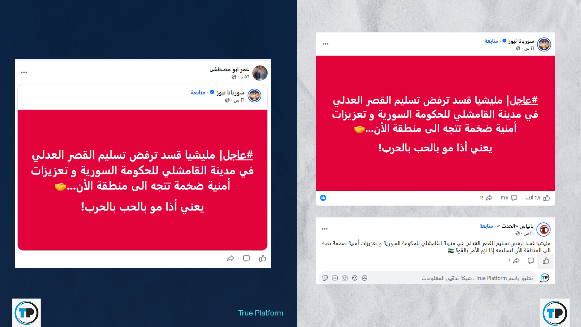 تحرى فريق شبكة تدقيق المعلومات – True Platform صحة الادعاءات المتداولة؛ عبر مراجعة الوسائل الإعلامية الرسمية والمستقلة، وإجراء بحث موسع في المصادر المفتوحة، بالإضافة إلى التواصل مع مصادر صحفية وميدانية في محافظة الحسكة؛ وتبين أن الادعاء غير صحيح.
