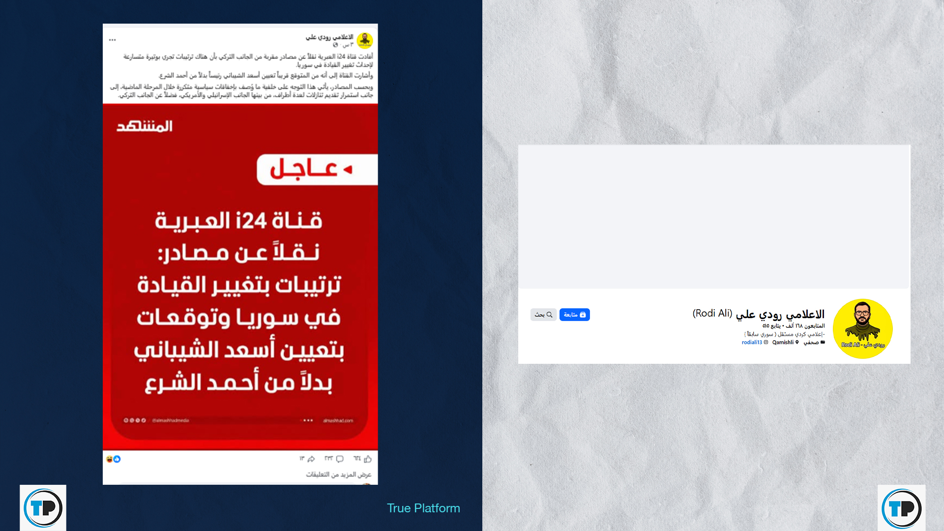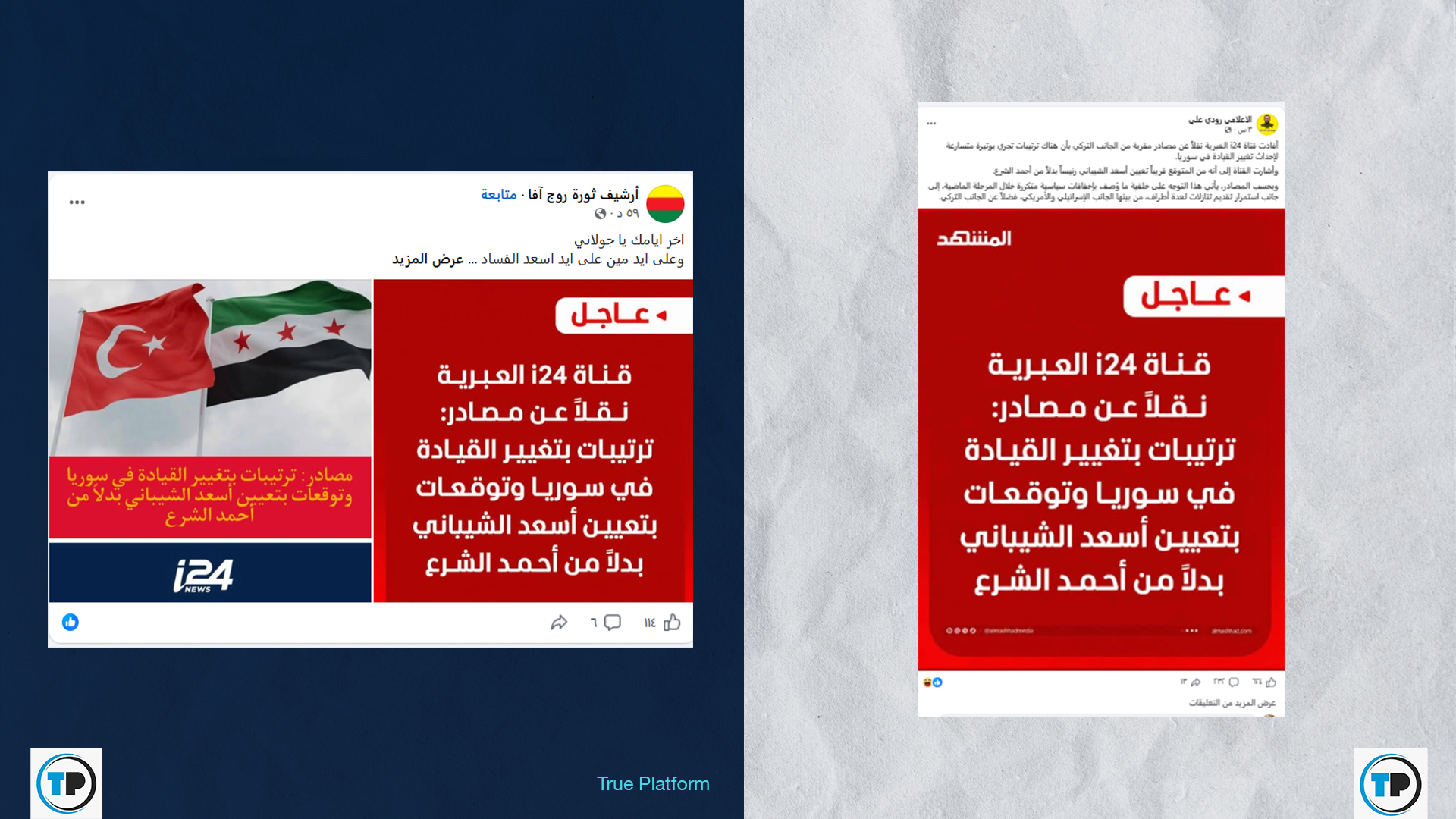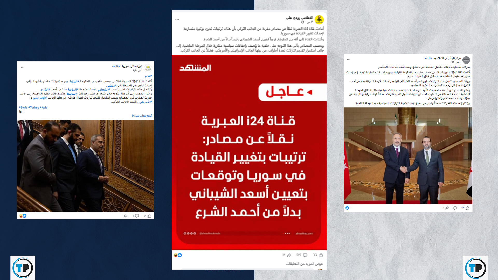 تداولت حسابات وصفحات عبر منصة فيسبوك مؤخراً، خبراً منسوباً لقناة “i24” العبرية، يزعم وجود ترتيبات متسارعة بدعم تركي لتعيين “أسعد الشيباني” رئيساً لسوريا بدلاً من “أحمد الشرع“، وذلك على خلفية ما وصفه الادعاء بـ “إخفاقات سياسية وتنازلات لأطراف دولية”.