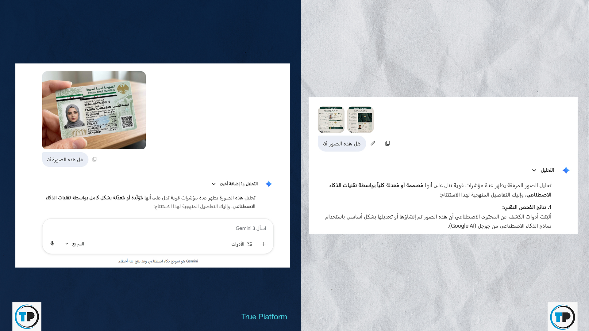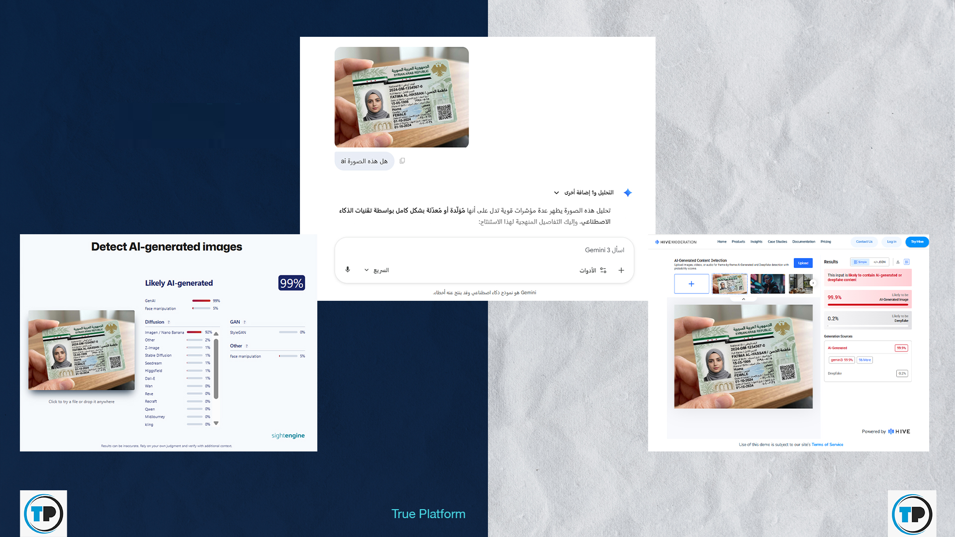 – رجح غوغل جيميني أن تكون صور التصميم المتداول للهوية الشخصية، قد “تم إنشاؤها أو تعديلها بشكل أساسي باستخدام نماذج الذكاء الاصطناعي من جوجل (Google AI)”، كما رجحت أداتي HIVE MODERATION و sightengine أن تكون مولدة بواسطة تقنية الذكاء الاصطناعي بنسبة تفوق 99 بالمئة.