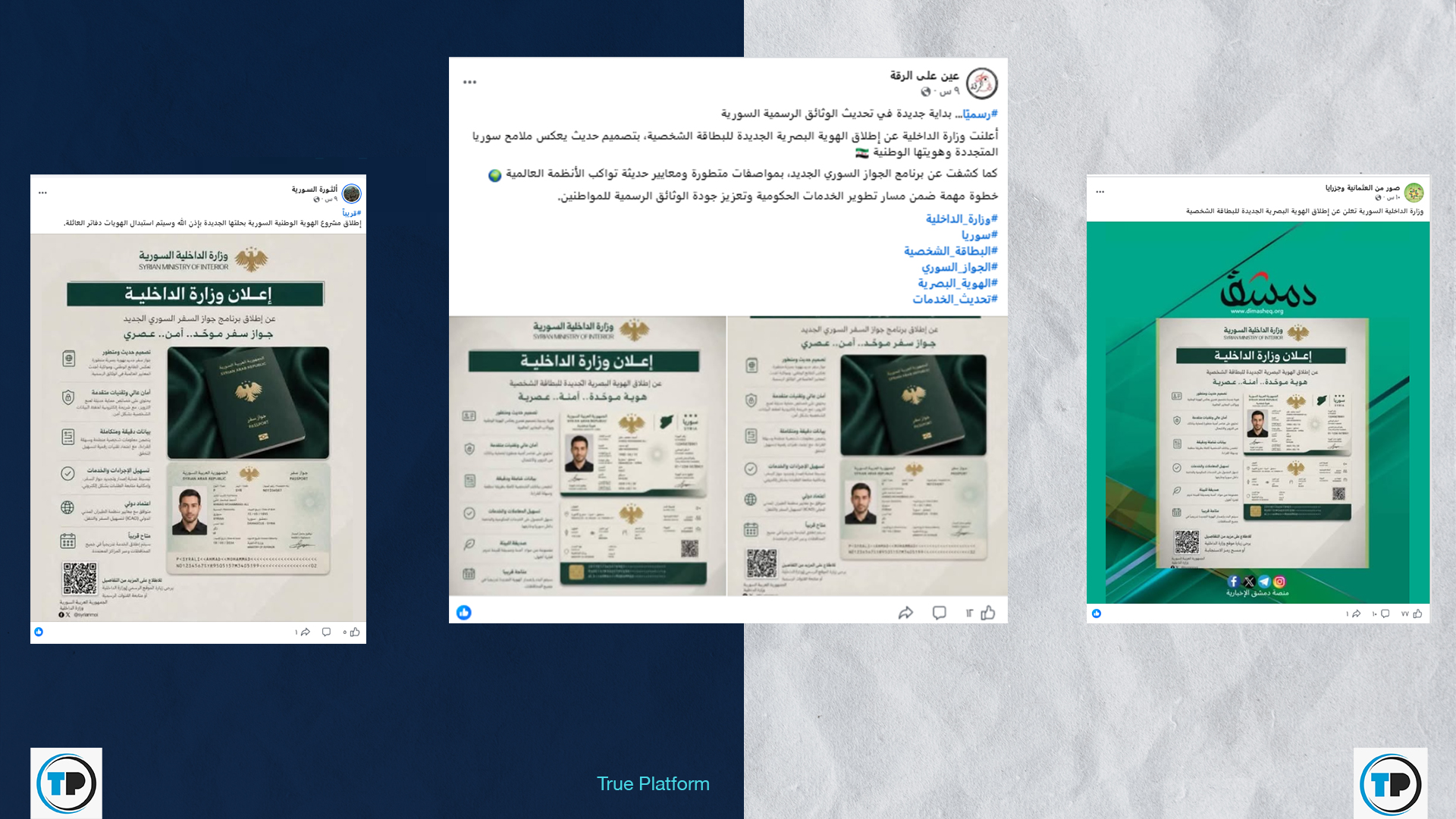 – لم يُعثر في الحسابات الرسمية لوزارة الداخلية على أي تصاميم جديدة للهوية الشخصية، أو إعلانات تتعلق بإطلاق الهوية البصرية الجديدة أو برنامج جواز السفر السوري.