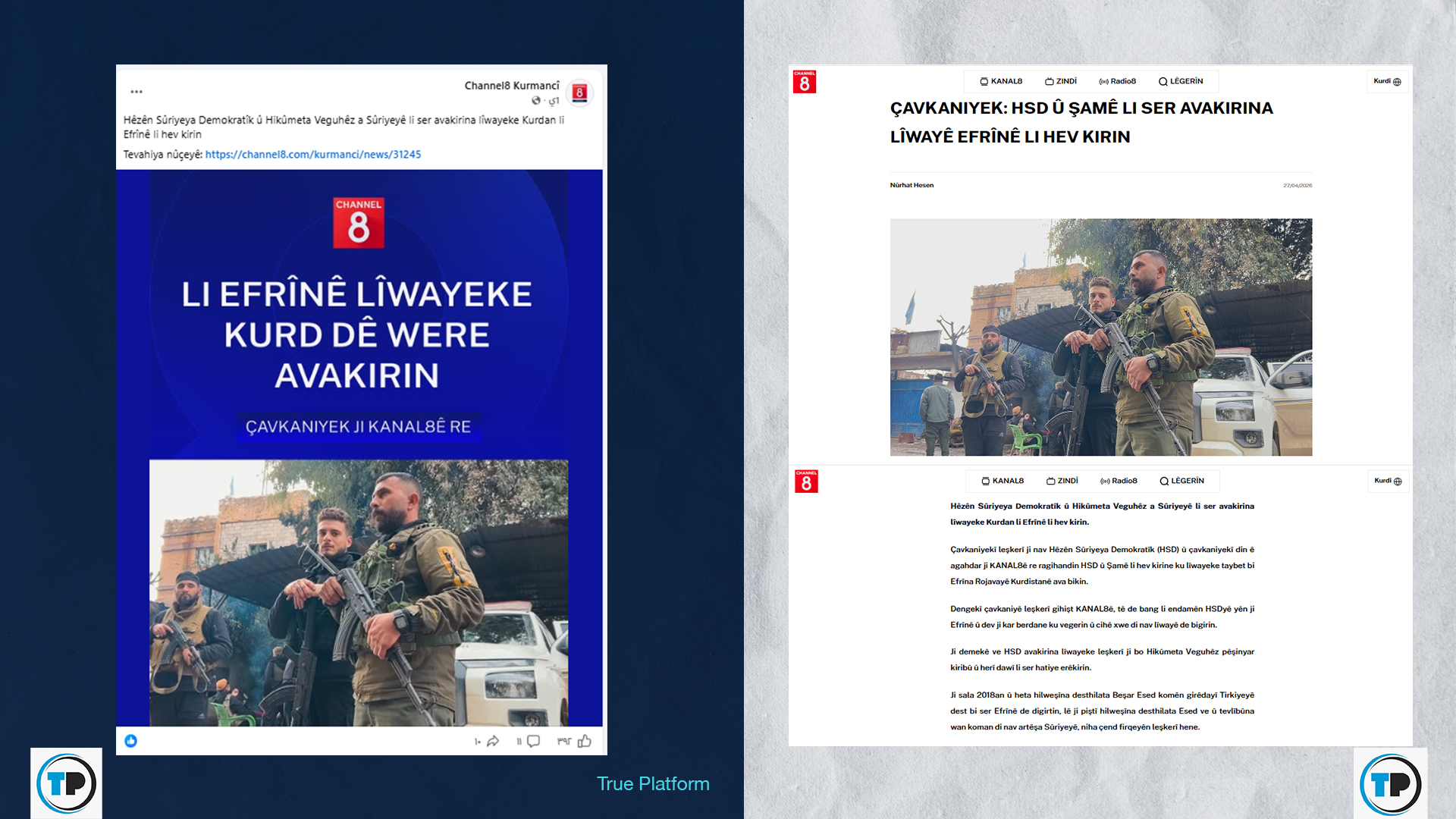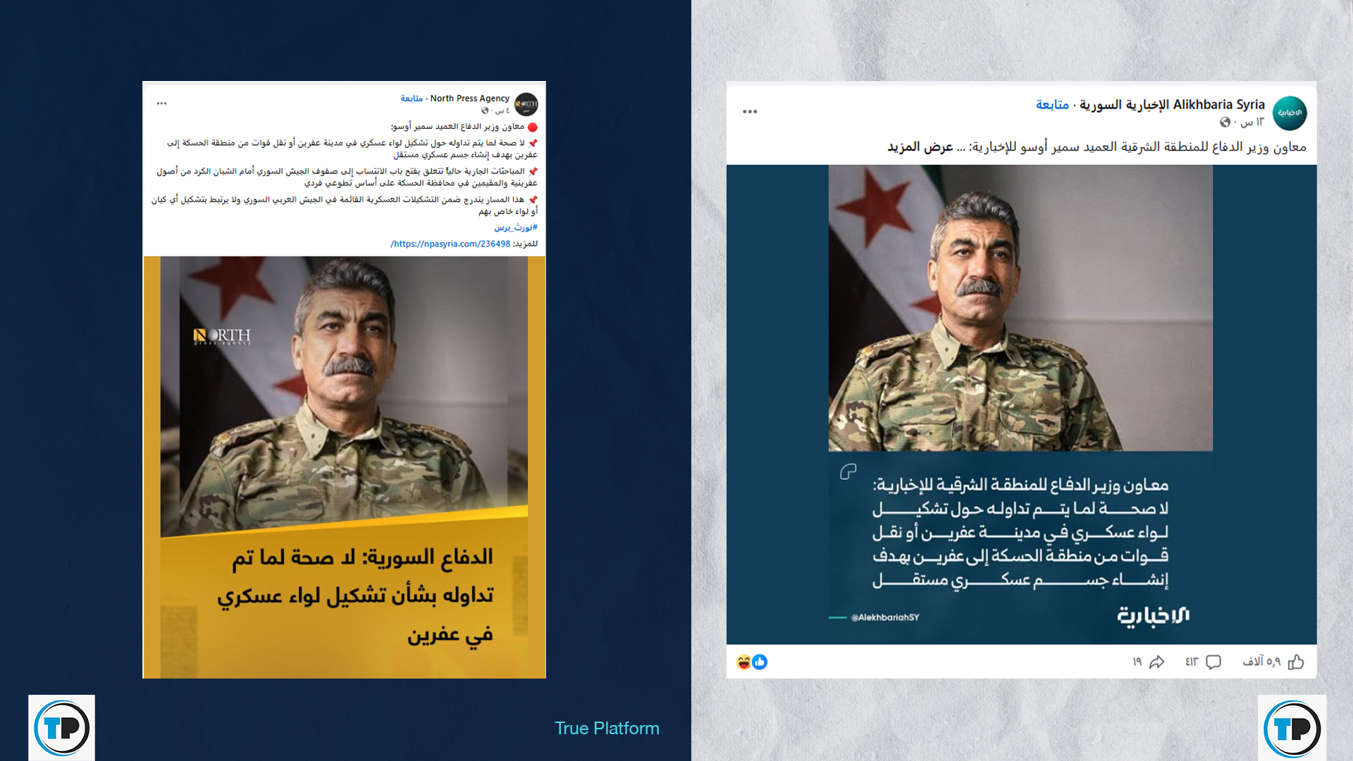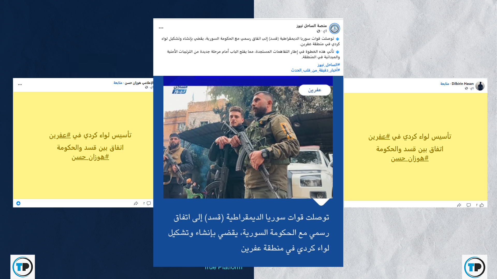 تداولت صفحات وحسابات عبر منصة فيسبوك مؤخراً، ادعاء يزعم توصل الحكومة السورية وقوات سوريا الديمقراطية (قسد) إلى اتفاق يقضي بـ”تشكيل لواء عسكري كردي” في عفرين شمال حلب.